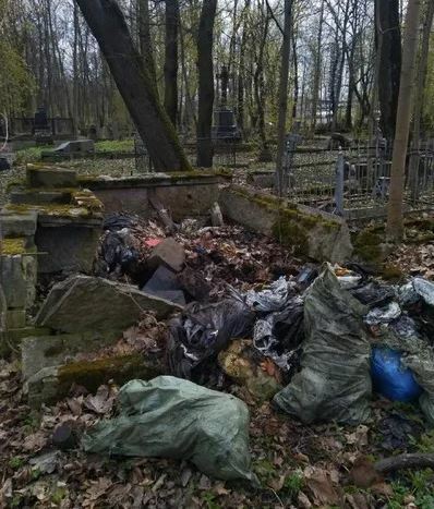 Мешки с мусором на переднем плане мы вытащили из склепа, куда рухнули и сами надгробия. Одно из них нам, к счастью, удалось опознать: