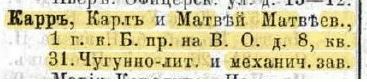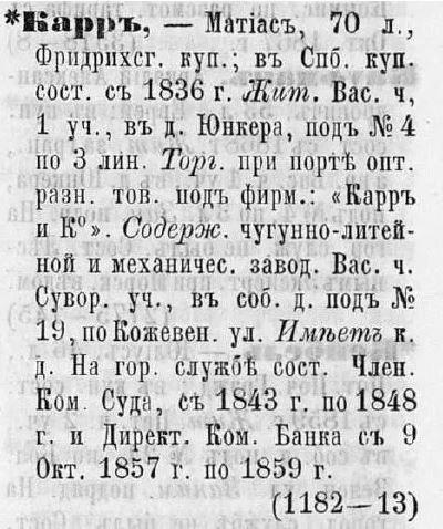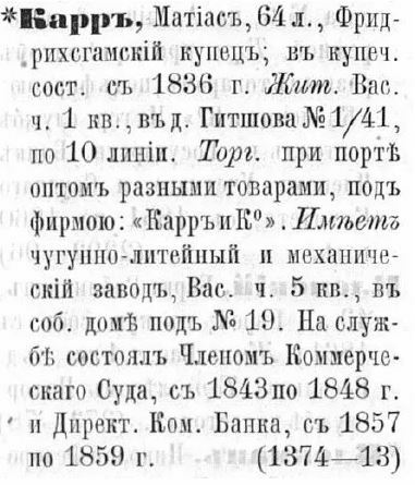 Возможно, вы думаете, что в таком случае именно Макферсона нужно считать основателем завода, но никак не Карра, который даже контракты редко просматривал. Это не так; основателями завода являются оба, поскольку идея, вероятно, принадлежала именно Мэтью Карру, кроме того, для строительства завода именно Карр приобрел участок земли на Васильевском острове в Чекушах (Кожевенная линия, д. 19, 20).