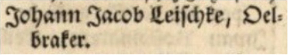 Вот оно! Мы получаем слово Oelbraker (Ölbraker/Ölbracker в более позднем варианте). Это слово переводится как “браковщик”. А чтобы подробнее узнать о браковщиках и Иоганне Якобе Лейшке, имя и профессию которого мы расшифровали, прочитайте этот текст.