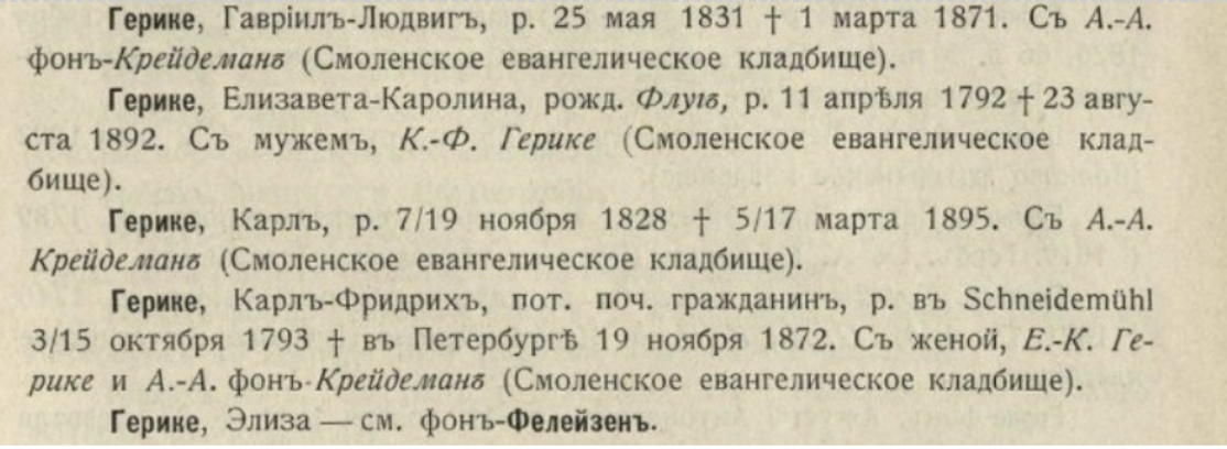 Пожалуй, пришло время поговорить о семье Маргареты Флуг и Ф.В. Крейдеманна. У Фридриха и Маргареты было пятеро детей: Александр (1779 – 1840), Михаил (1780 – 1812), Анна (1781 – 1814), Елена (1784 – 1806) и Екатерина (1789 – 1811). К сожалению, почти все они умерли в довольно молодом возрасте буквально друг за другом: Елена умерла в 22 года в 1806 году, потом в 1811 — Екатерина, ей тоже было 22, год спустя — Михаил (ему было 32), и после него, в 1812, Анна, тоже в 32 года. Все они (и их родители, Фридрих и Маргарета) погребены на СЛК.