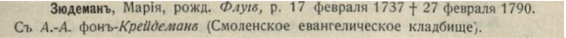 Вот Анна фон Крейдеманн, ее дядя Иоганн Августус Флуг (купец Иван Иванович), о котором мы говорили выше, и еще две женщины: Мария Зюдеманн (Флуг) (1737 – 1790) и Анна Флуг (1746 – 1819). О них мы поговорим в следующей части.