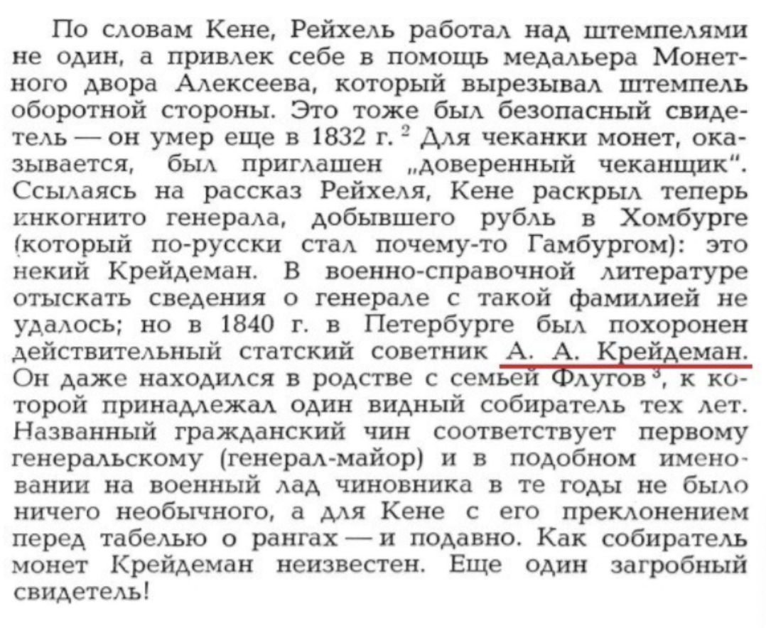 В интереснейшей книге И.Г. Спасского “По следам одной редкой монеты”, посвященной рублю Константина (того самого, кто должен был взойти на престол после смерти Александра I) упоминается А. Крейдеманн (правда, с другим отчеством, но имя, родство с Флугами (он был внуком И.Г. Флуга) и год смерти совпадают):