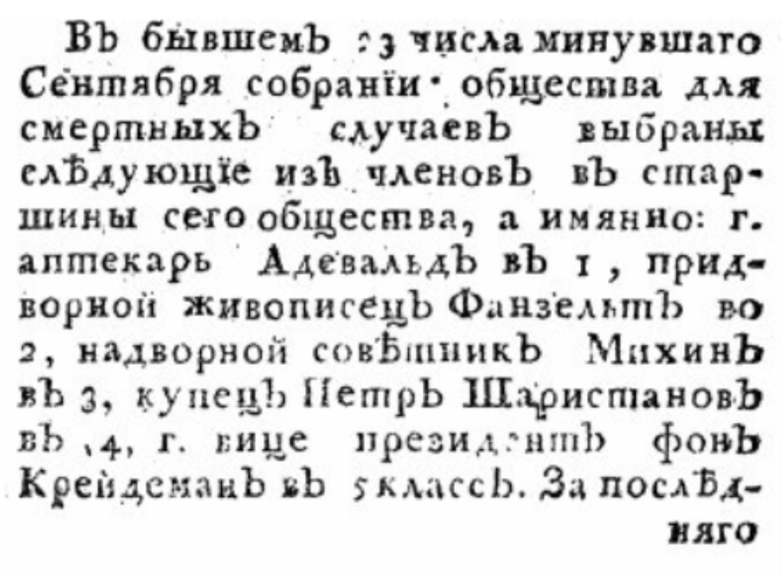 В 1781 году Ф. Крейдеманн стал старшиной Общества для смертных случаев при лютеранской немецкой церкви св. Екатерины в Петербурге (о нем я упоминала в своих предыдущих текстах, например, в этом) — это что-то вроде страхового общества: