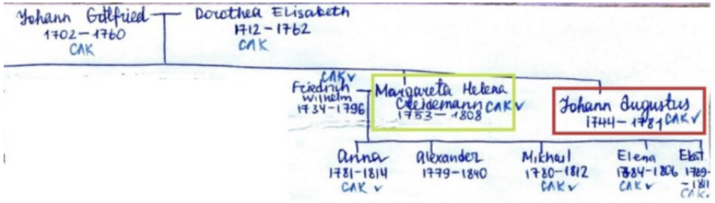 По книге видно, что поженились они в Дерпте (сейчас — Тарту) 4 апреля 1734 года. У пары было трое детей (о которых точно известно): сыновья Иоганн Августус (1744 – 1781), Генрих Габриэль (1745 – 1833) и дочь Маргарета Хелена (1753 – 1808). Но, забегая вперед, было еще трое детей, информацию о которых я установила по документам и косвенным доказательствам — о них я тоже расскажу.