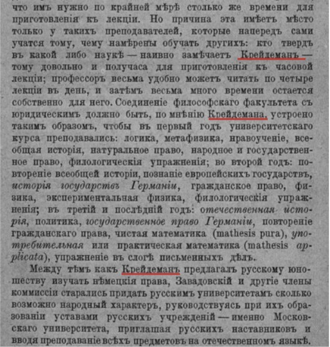 Кроме того, Ф.В. Крейдеманну в 1784 году было поручено составить планы предполагавшихся 6 университетов в России. Планы были довольно специфичны: в них было предусмотрено изучение истории, географии, права… Германии, изучение же истории, географии и права России отсутствовало.