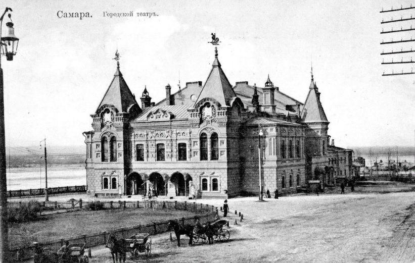 Невероятно красивое здание драмтеатра в неорусском стиле появилось в Самаре ближе к концу XIX века в живописнейшем месте: на естественной возвышенности, слева внизу — зеленые волны Струковского сада, за ним синяя лента Волги, вдалеке панорама Жигулевских гор в вечной дымке, справа — белокаменная колокольня Иверского монастыря и пятиглавая громада Сретенского собора…