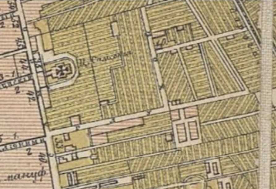 На карте видно, что территория православного кладбища (вокруг собора, светлый участок) свободна, а часть участка восточнее покрыта полосами — так на карте отмечали огороды. Вполне возможно, что часть православных захоронений ушла под огороды, в начале XIX века это было частой практикой. Южнее мы видим Глухой переулок (обратите внимание, что он окружает территорию кладбища), а еще южнее — снова огороды и какие-то постройки на территории иноверческого кладбища.