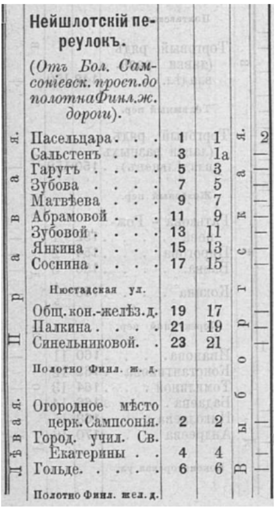 От Большого Сампсониевского проспекта до ул. Нюстадской (сейчас это часть Лесного проспекта, см. карту) по правой стороне было 9 домов (позднее — еще больше), а по левой — огороды церкви Сампсония Странноприимца, городского училища св. Екатерины и дом Гольде, то есть переулок был застроен довольно плотно именно с той стороны, где находилось иноверческое кладбище.