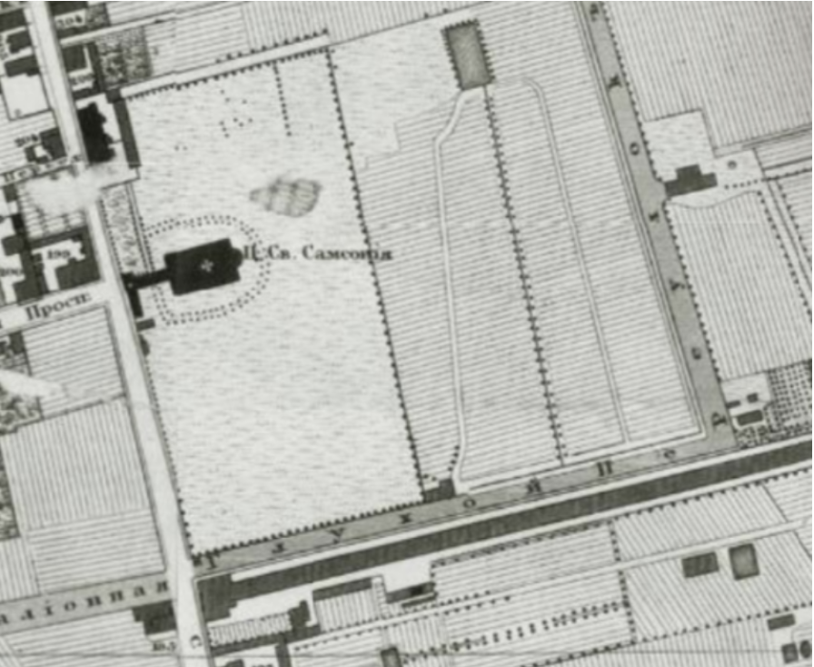 Обратите внимание, что дорога южнее кладбища существует очень давно — вероятно, с самого начала XVIII века, когда был заложен собор и основаны некрополи. Дорога служила не только для проезда, но и была естественной границей между двумя кладбищами: православным и иноверческим. Последнее исчезло, судя по всему, еще раньше православного, в 1760-е, поскольку на поздних картах его уже нет, а территория отдана под огороды (при этом участок православного кладбища вокруг церкви под огороды не отдан):