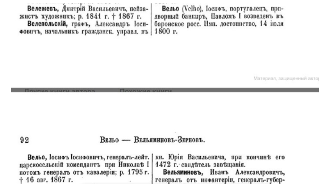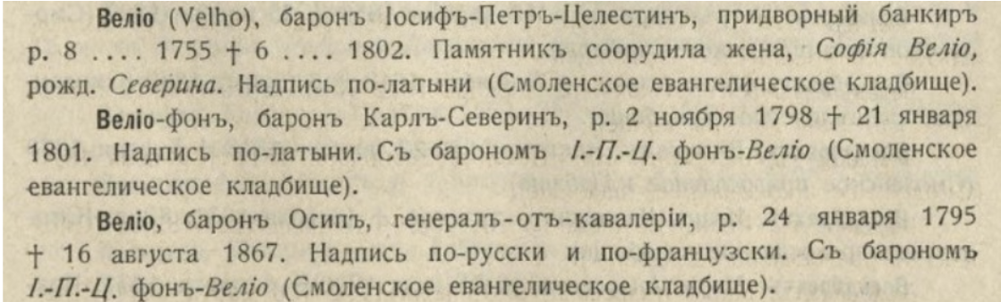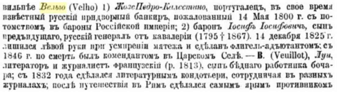 Попробуем понять, что за род Вельо такой! Смотрим Энциклопедический словарь Брокгауза и Ефрона: Велио (Velho) — pyccкий дворянский род португальского происхождения, возведенный в баронское достоинство в 1800 г.
