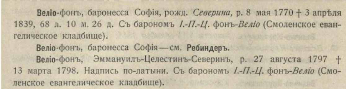 Софья Вельо, в замужестве Ребиндер, имела шесть детей, двое из которых умерли в младенчестве и похоронены вместе с ней на СЛК (одной из них была младенец Екатерина, умершая в 1838 году, о которой мы говорили выше). Ее дочь Софья была фрейлиной двора, сыновья Александр и Николай — военными, причем Александр управлял доставшимся ему по наследству сахарным заводом. Все трое погребены в Висбадене, рядом со своим отцом, уехавшим из России.