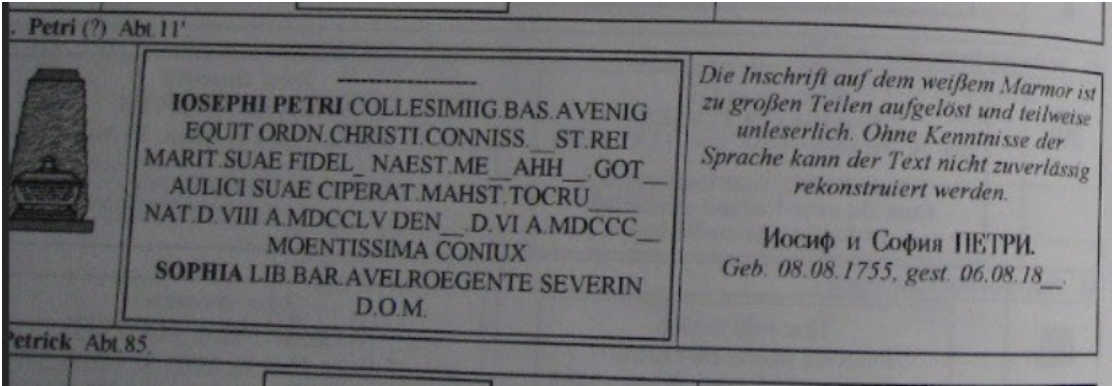 Надгробие, кстати, упоминается у Р. Лейнонена, но он ошибся с истолкованием латинского текста, приняв второе имя — за фамилию (как мы теперь знаем, PETRI — это одно из имен):